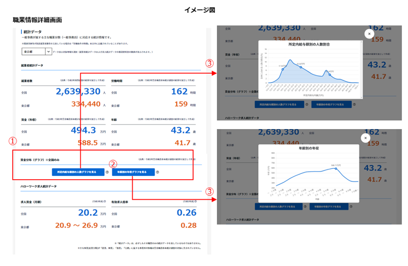 職業情報詳細画面の統計データ内に賃金関連グラフとして、所定内給与額別の人数グラフ・年齢別の年収グラフの2つが追加されました。