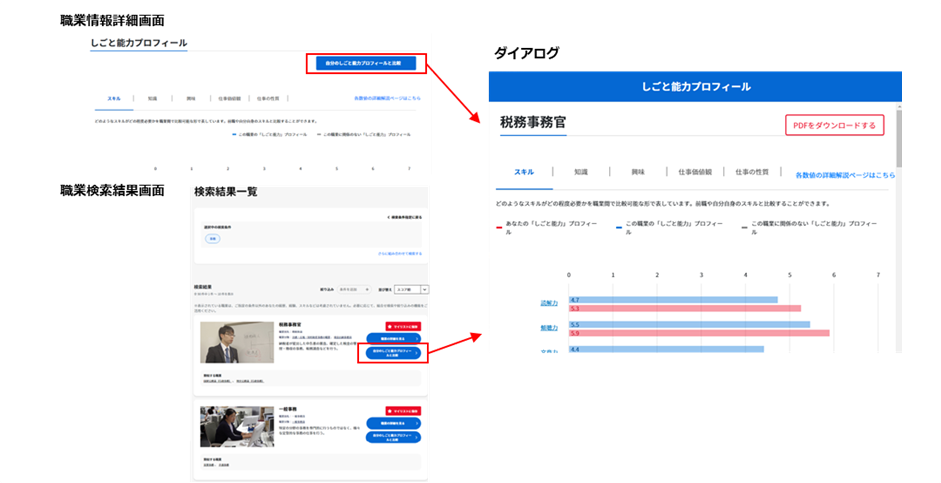 職業情報詳細画面や職業検索結果一覧画面から自身が保存した「しごと能力プロフィール」を呼び出し、その職業のしごと能力プロフィールとの比較ができるようになりました。自分の「しごと能力プロフィール」と気になる職業に必要なスキル・知識などを簡単に比較し、マッチする職業を探したり、現状の自分に足りてないスキル・知識を明確化することができます。
