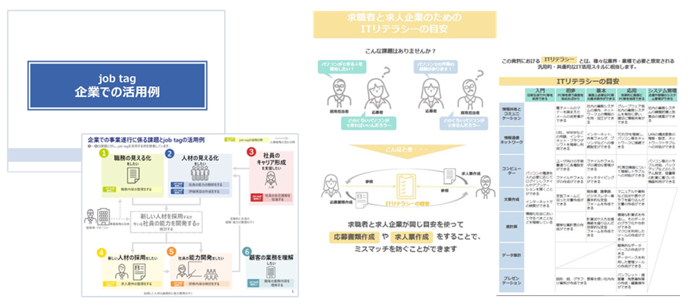 企業におけるjob tagの活用例をまとめたガイドを掲載しました。職務の見える化、人材の見える化、社員のキャリア形成、人材の採用、社員の能力開発、顧客の業務の理解など、いろいろな場面での使用方法や企業の声をご紹介。他にも、求職者と求人企業のためのITリテラシーの目安など、採用などに役立つ情報を追加しました。