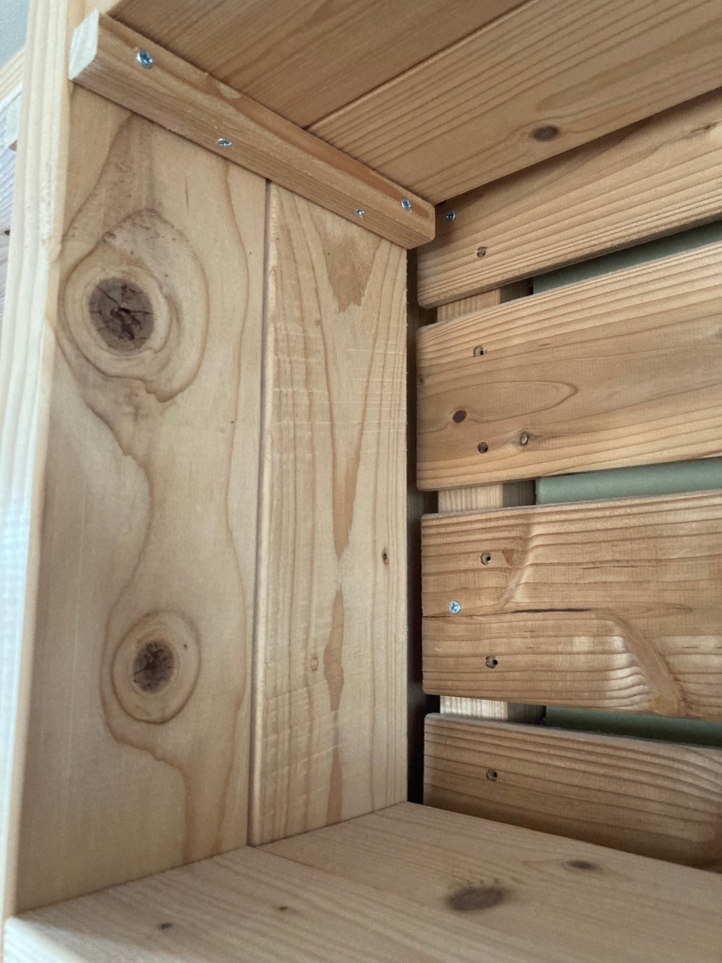 また、棚受けの長さは1x4材2枚分の178mmで固定しており、長さの調整が必要なのは棚板の横幅だけでしょう。
