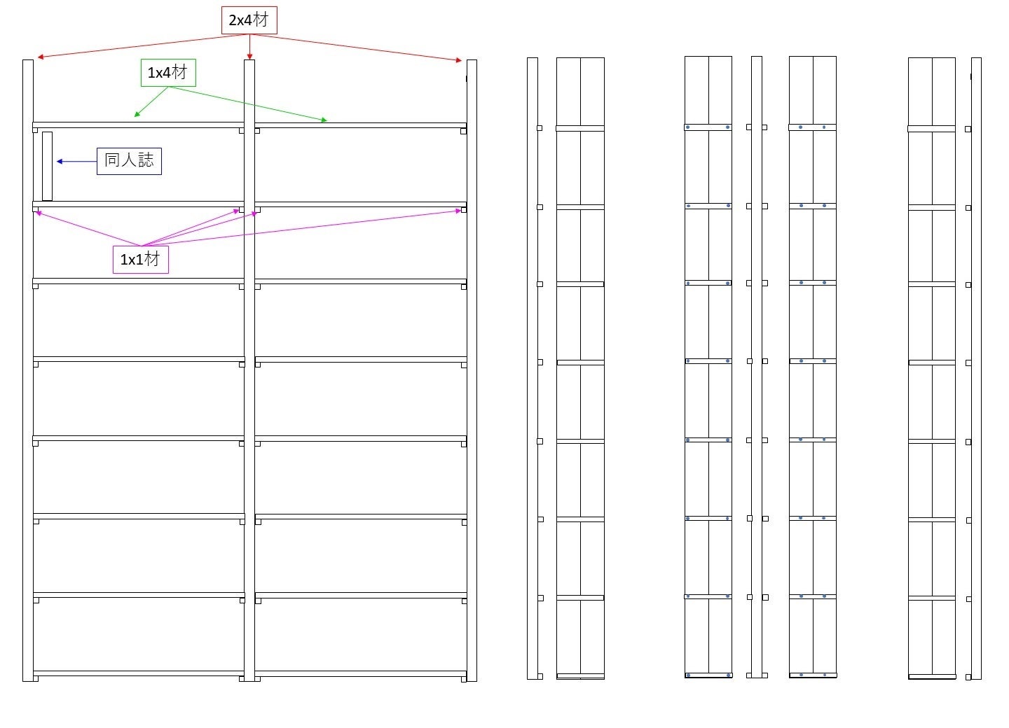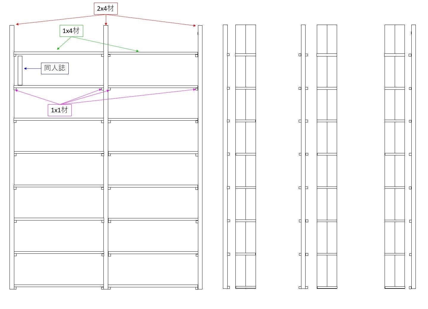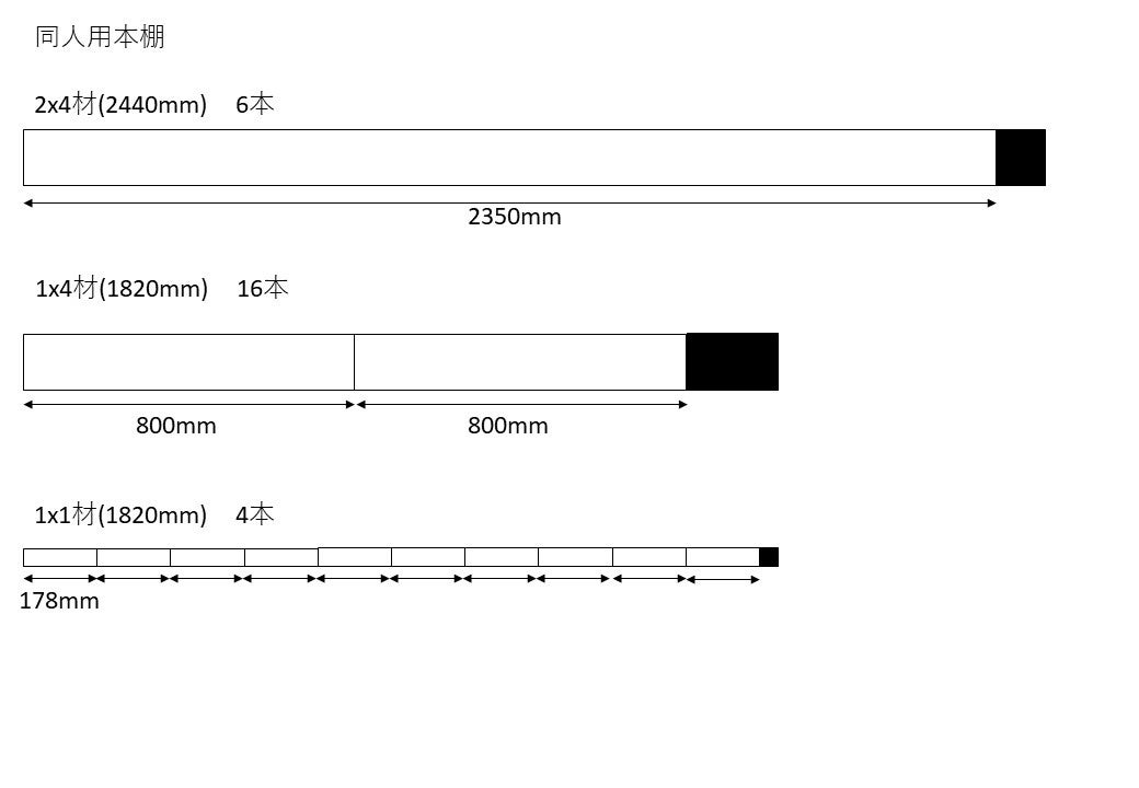 市販では同人誌がきれいに収まる本棚がなく、また自分の想定する壁の横幅にピッタリと収まるサイズもなかったため、どうしようかと調べていたところ、2x4材の幅が89mmで、2枚合わせると178mmと壁面と本棚の間に僅かな空間を作れば同人誌がきれいに収まることに気づき、ホームセンターで買える2x4材・1x4材・1x1材を使って自作しました。