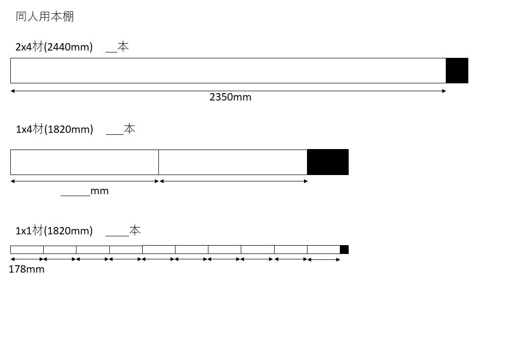 一先ず下の画像を印刷して、木材の本数と棚板の長さを測って書けば、ホームセンターで切ってくれる形になっています。