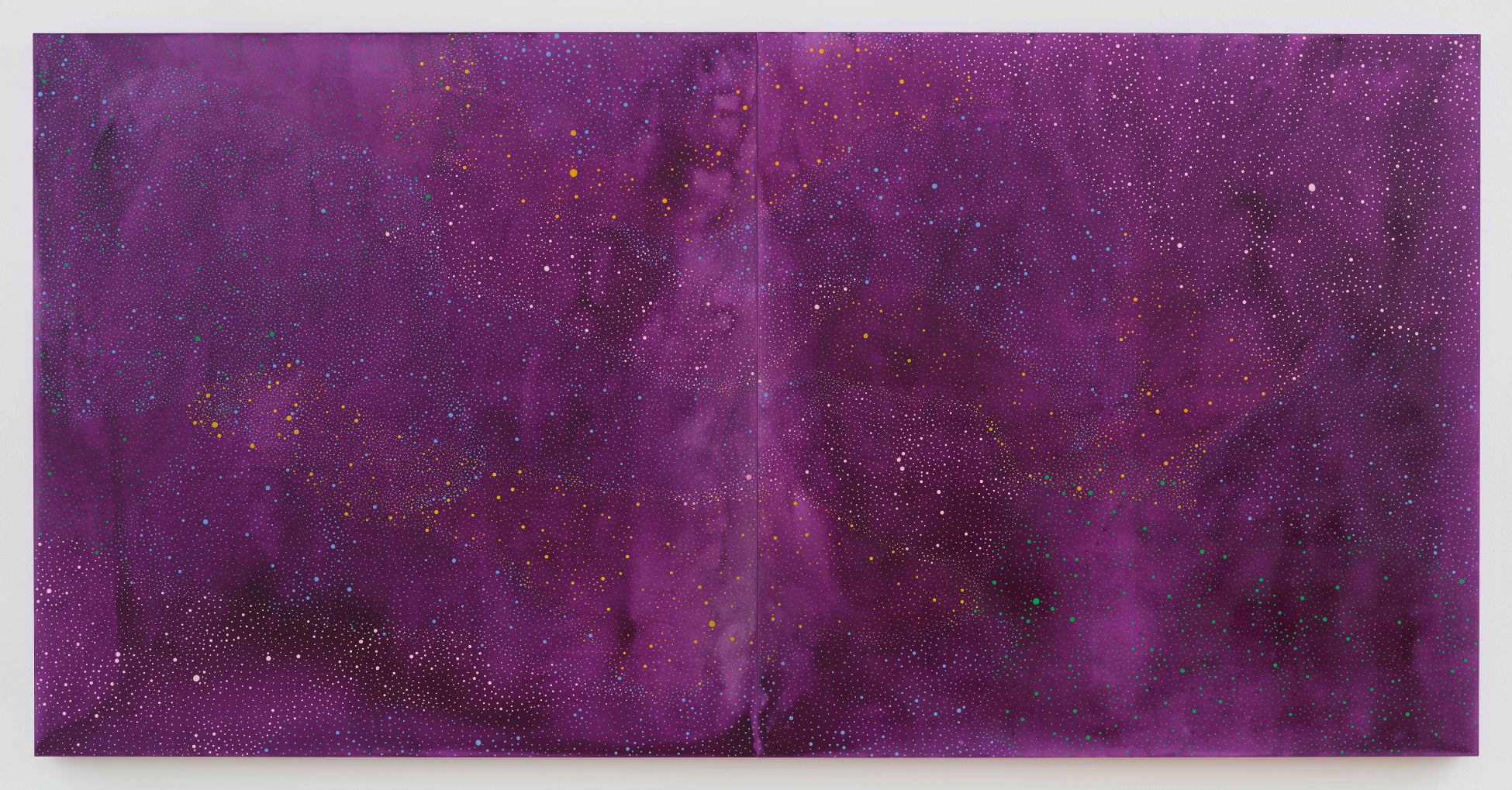 チャンの新作は、花びらや雫、飛沫、細胞のような形態の群れと有機的な色面とが、心地よく調和する世界です。その美しい色彩で彩られた画面は、生物の紋様のようであり、あるいは地図やエネルギーの流れを表している相関図のようにも見えます。あるいは、私たちの体の中に宿る胎内の生命を暗喩する抽象画とも読み取ることができるかもしれません。そこには計画された規則性があるように見受けられますが、寄せては返す波のように、予測不可能な生命の情動を予感させます。