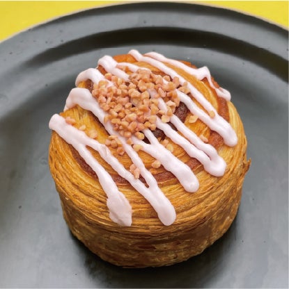 クロワッサン生地に桜餡を巻き上げたロール。トッピングには、桜のリキュールを混ぜたピンクのアイシング・ラズベリーを混ぜたアーモンドクラックランを使用しています。