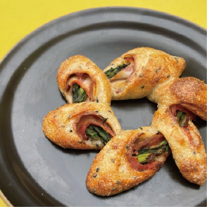 (吉祥寺店ベーカーより)吉祥寺店で人気の高いベーコンエピをアレンジしたアイテムです。ベーコンと一緒に旬の食材である菜の花を包み、春らしさをイメージしました。菜の花の味を引き立たせるため、生地に鰹節とゴマを練り込み香り高い生地に仕上げました。