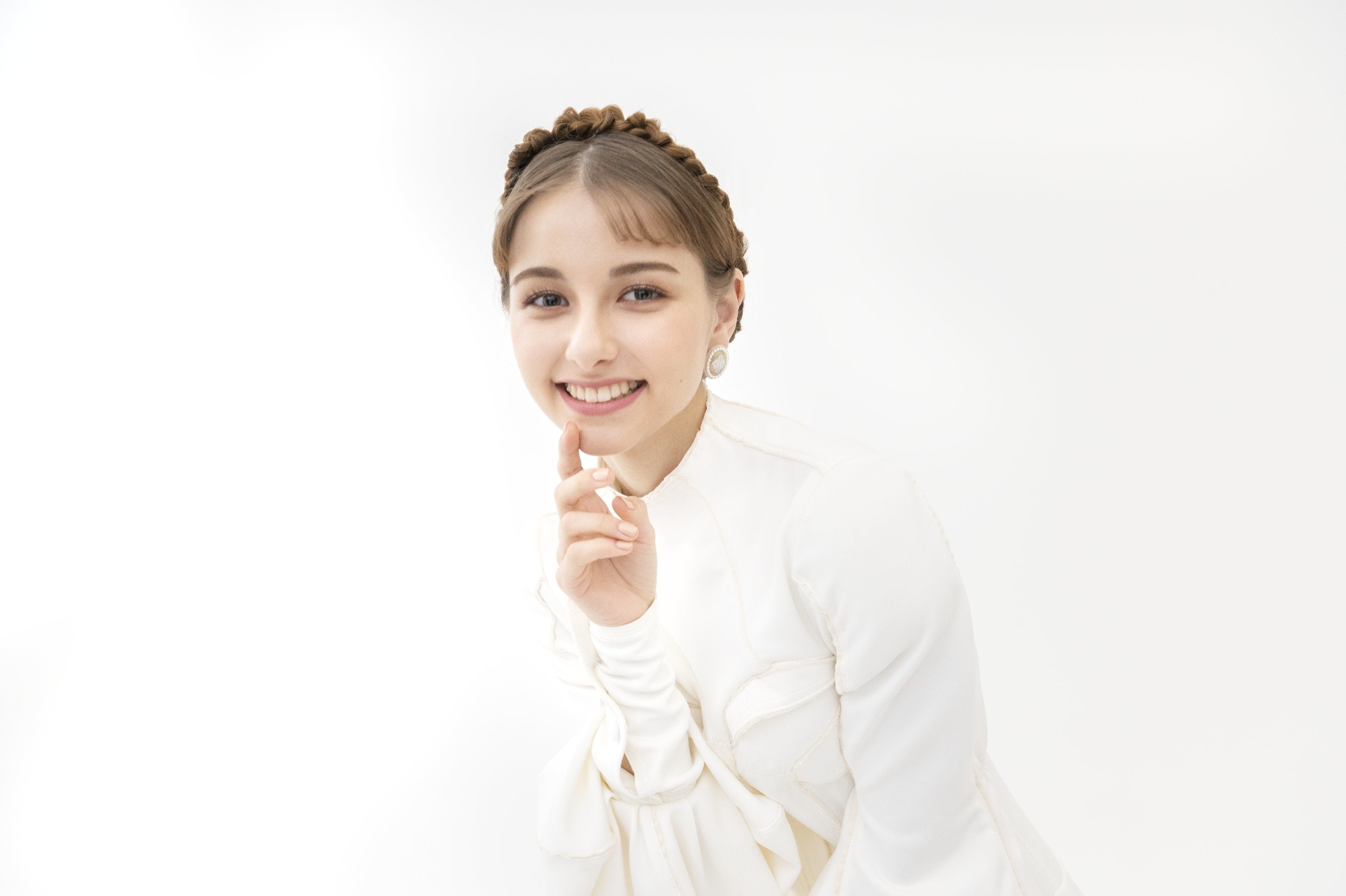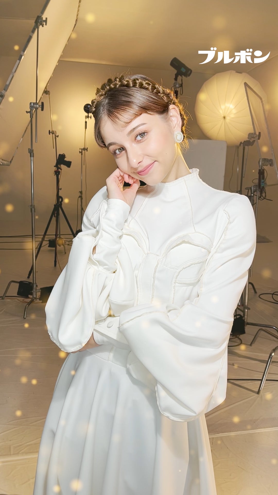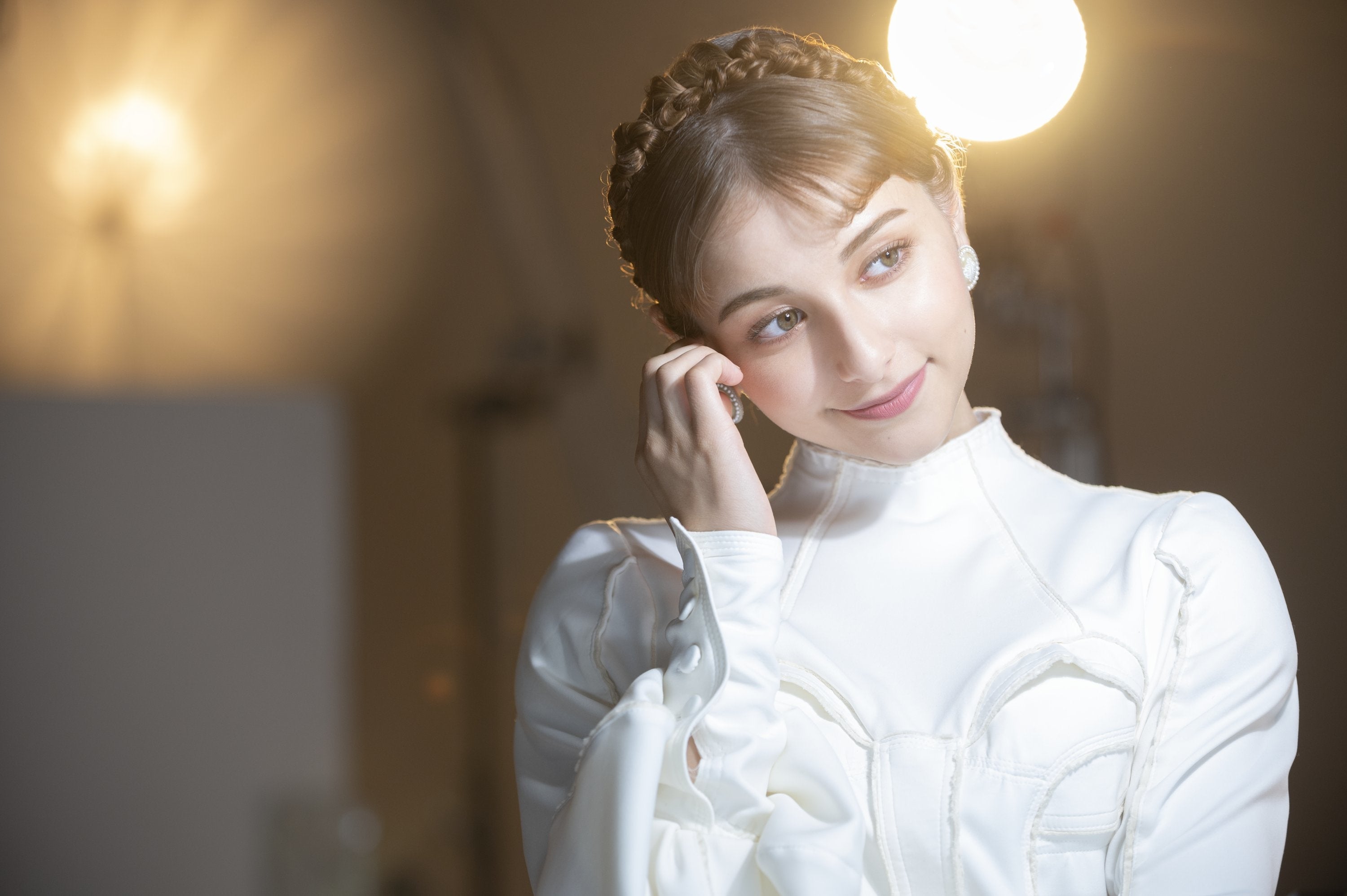 「ホワイトロリータ」の名前にちなみ、衣装はエレガントさを残しつつも嵐莉菜さんのスタイリッシュさにマッチしたモードな白ワンピースです。ヘアスタイルは編み込みのアップヘアで上品な印象を与えています。