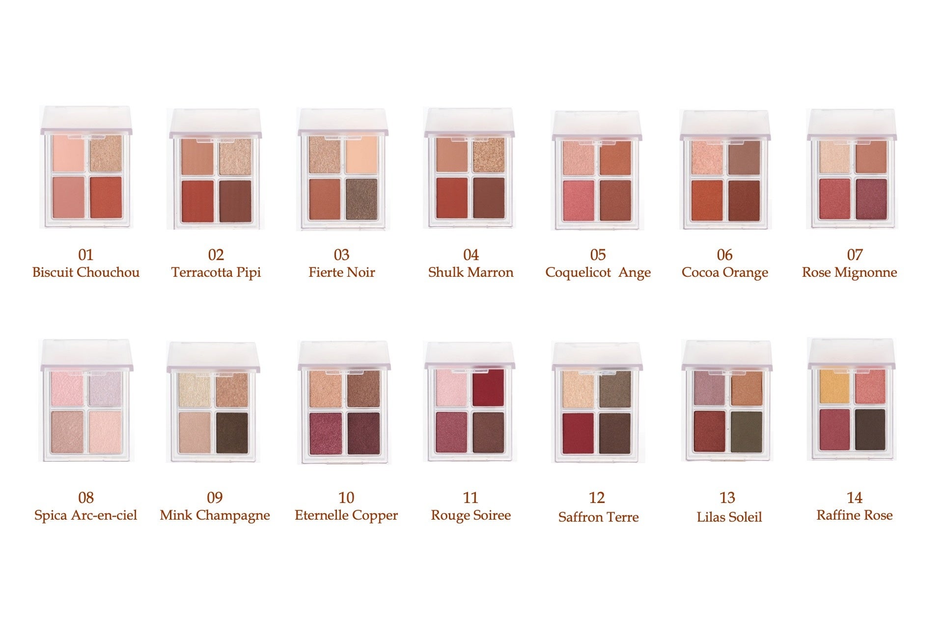 質感の異なる4色を組み合わせたアイシャドウパレットは、見たままの高発色でありながら肌に溶け込むようになじみ、4色が織りなす美しいグラデーションが印象的な表情を演出します。色をレイヤードする順番や濃淡を変えることでニュアンスの変化が生まれ、パレットひとつで異なる雰囲気のアイメイクを楽しむことができるアイテムです。全14種の多彩なカラーバリエーションがあなたの新たな魅力を引き出します。