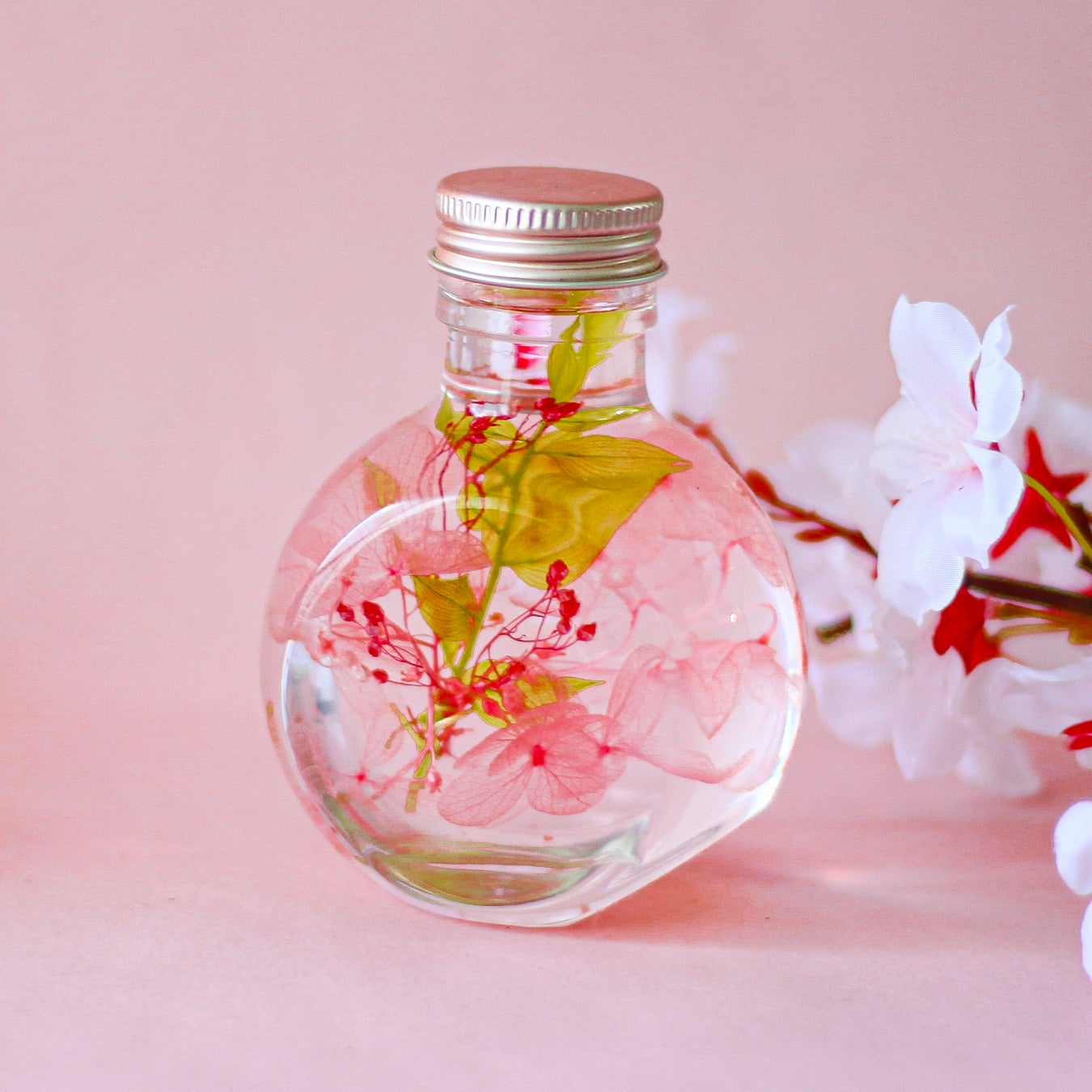 ボトルを上下にひっくり返したり、傾けたりすればガラスの中では花たちがゆっくりと優しく揺れ動き、光が通過する度に葉脈が透き通りキラキラと輝く花弁には、これまでに見たことの無い幻想的な世界が映し出されます。 時を超えても変わらずそこに花がある暮らしは、日々を彩り、自然の持つみずみずしい生命力を感じることができます。「FLOWERiUM®」は、そんな花と共に暮らす新しいライフスタイルをご提案いたします。