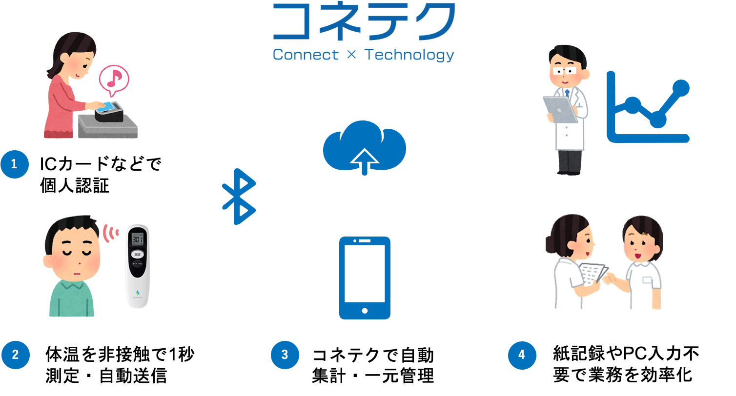 介護施設や訪問介護などで利用頻度の高い非接触体温計 「TM-101B」に対応することで、すでに対応済の血圧計、パルスオキシメータなどと合わせ、「コネテク」でさらなるバイタルデータの活用が可能となります。