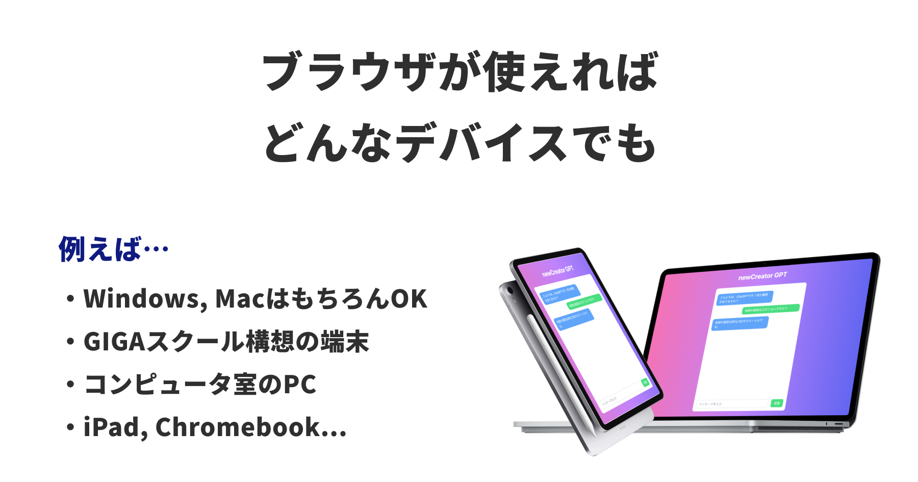 ・授業ではパソコンやiPadなどWebブラウザーが動作するデバイスを使用します。参加する生徒・学生の人数分のデバイスをご用意いただいた上でお申し込みください。パソコン室等にある共用PCでも問題ございません。ご不安・ご相談があれば、事前にお問い合わせください。