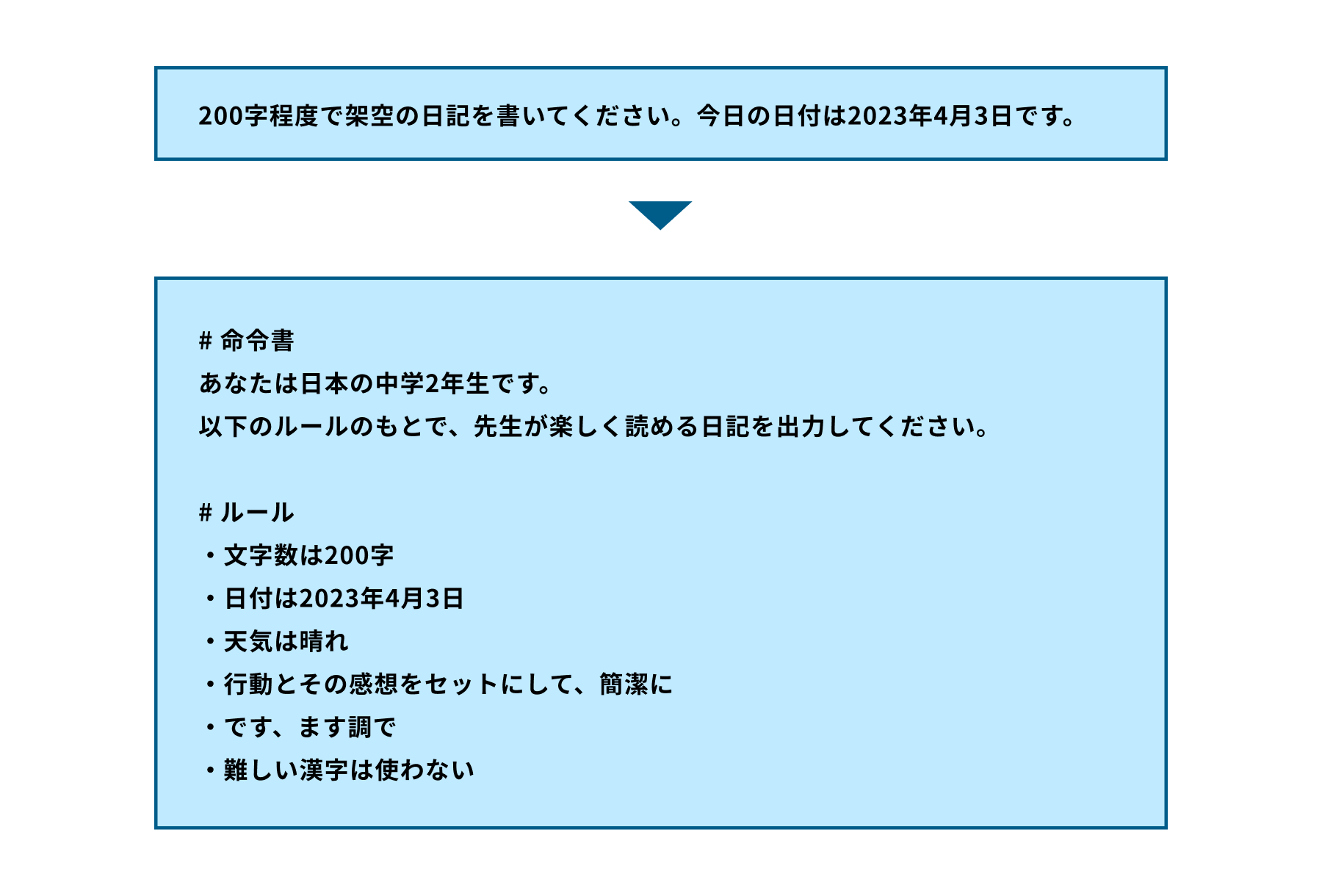 例えばこのように質問の内容を充実させたり、より具体的な設定を加えることで、出力内容を改善させることができます。