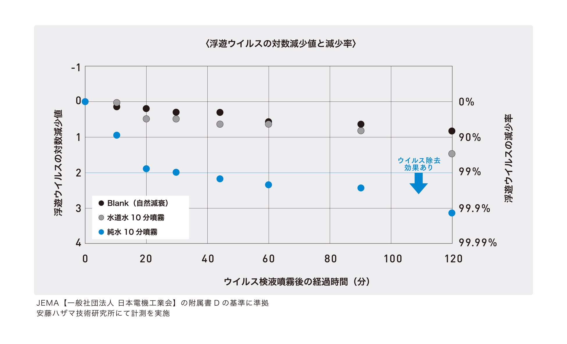 しかし、安藤ハザマ技術研究所との共同研究、試験を行った結果、純水をウルトラマイクロミストにして噴霧することにより、ウイルスを99.9%減少させることに成功しました。この、画期的なテクノロジーについて製品の特許を2024年9月に取得いたしました。