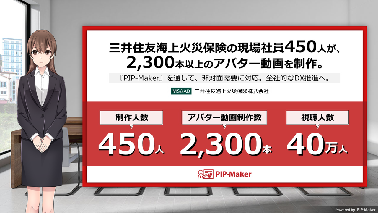 大企業の自律的なDXを推進するアバター動画作成サービス『PIP-Maker』(ピーアイピーメーカー)を提供する、株式会社4COLORS(本社:神奈川県横浜市、代表取締役 加山 緑郎、以下4COLORS)は、三井住友海上火災保険株式会社(以下、「三井住友海上」)が『PIP-Maker』を2019年より導入開始し、2年6ヶ月で約450人の本社社員が、既存のパワーポイント資料から2,300本以上のアバター動画を制作したことをお知らせします。