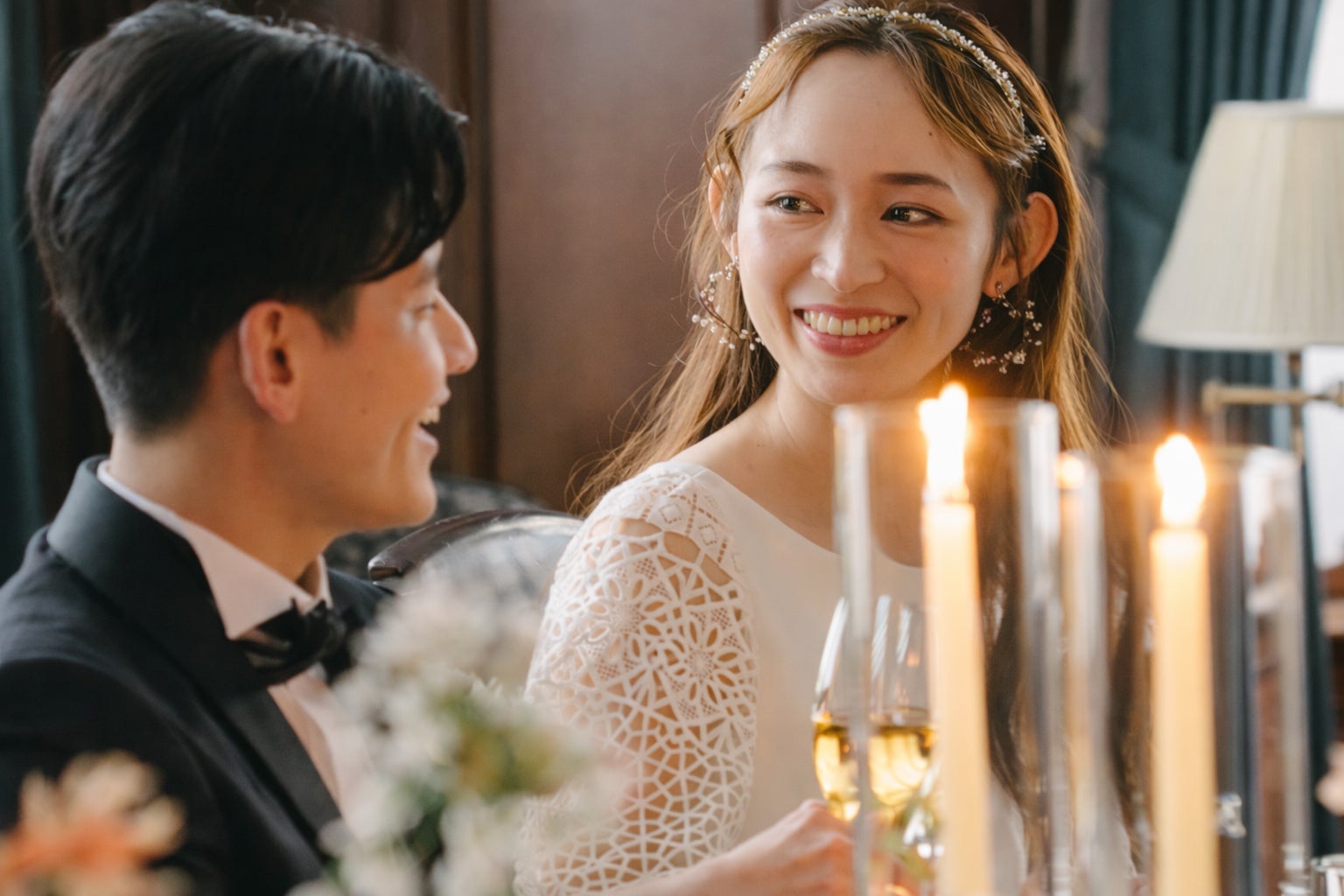 篠田邸では、当日宿泊を含む1泊2日プランもご用意しています。洋と和、それぞれ趣の異なる客室に滞在しながら、大切なゲストとゆっくり語らう夜は、一般的な結婚式では味わえない特別な時間。歴史ある洋館に灯りがともる夕刻から始まる祝宴は、より親密で温かな空気に包まれます。形式にとらわれず、自然体で過ごせる滞在型だからこそ叶う、心地よい余韻のあるウェディングスタイルです。
