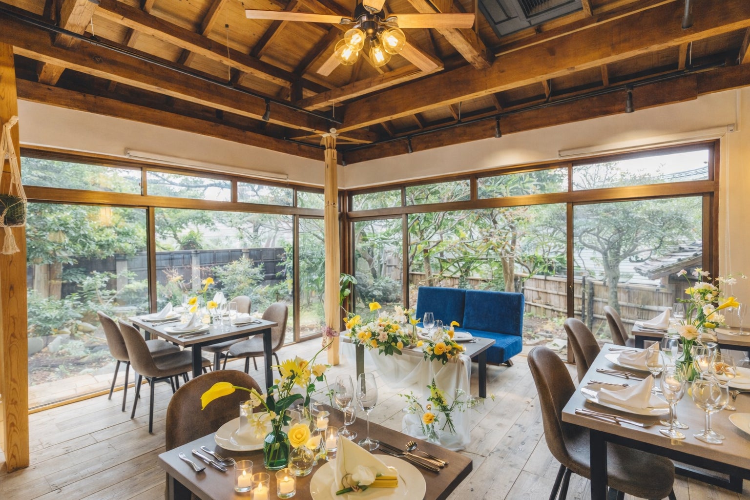 篠田邸では、併設の古民家カフェを舞台にした2次会プランも用意されています。庭園を望む開放的な空間は、歴史ある洋館とは異なる、鎌倉らしい自然体の魅力に満ちた場所。緑豊かな庭の景色と柔らかな自然光に包まれながら、ゲストとの距離が自然と近づく温かな祝宴が叶います。料理やドリンクを含み、20名様で税込40万円〜(立食・最大25名まで)という明瞭な料金設定も安心感のひとつ。結婚式の余韻をそのままに、肩肘張らない心地よい時間を楽しめます。