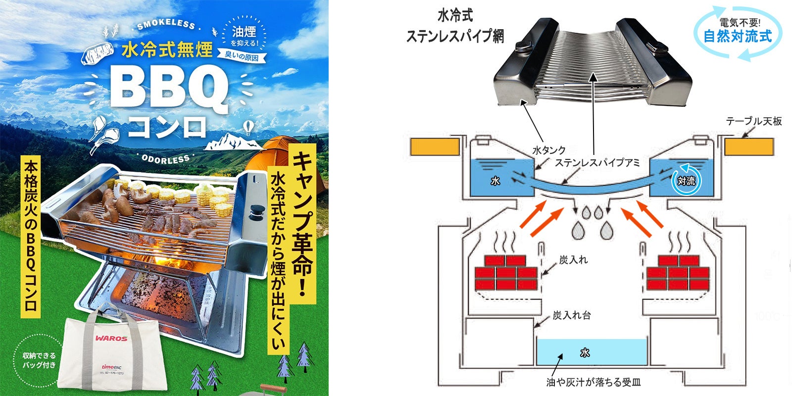 商品名:炭火焼き水冷式無煙ポータブルBBQコンロ
