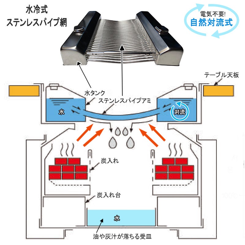 両側のタンクからパイプへ水が自然対流することで、網の温度を150℃以下に保ちます。