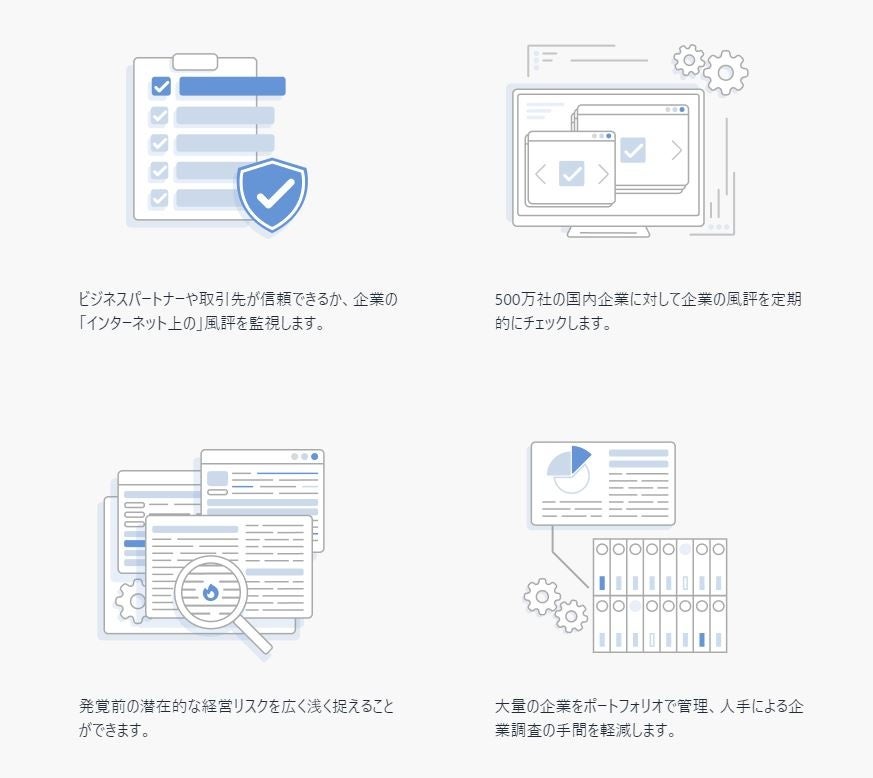 RuMoRuは国内約500万社の企業の「インターネット上の」風評を確認・監視するためのツールとなっており、金融機関様や事業会社様での新規営業先や取引先のモニタリングなどでのご利用を想定しております。
