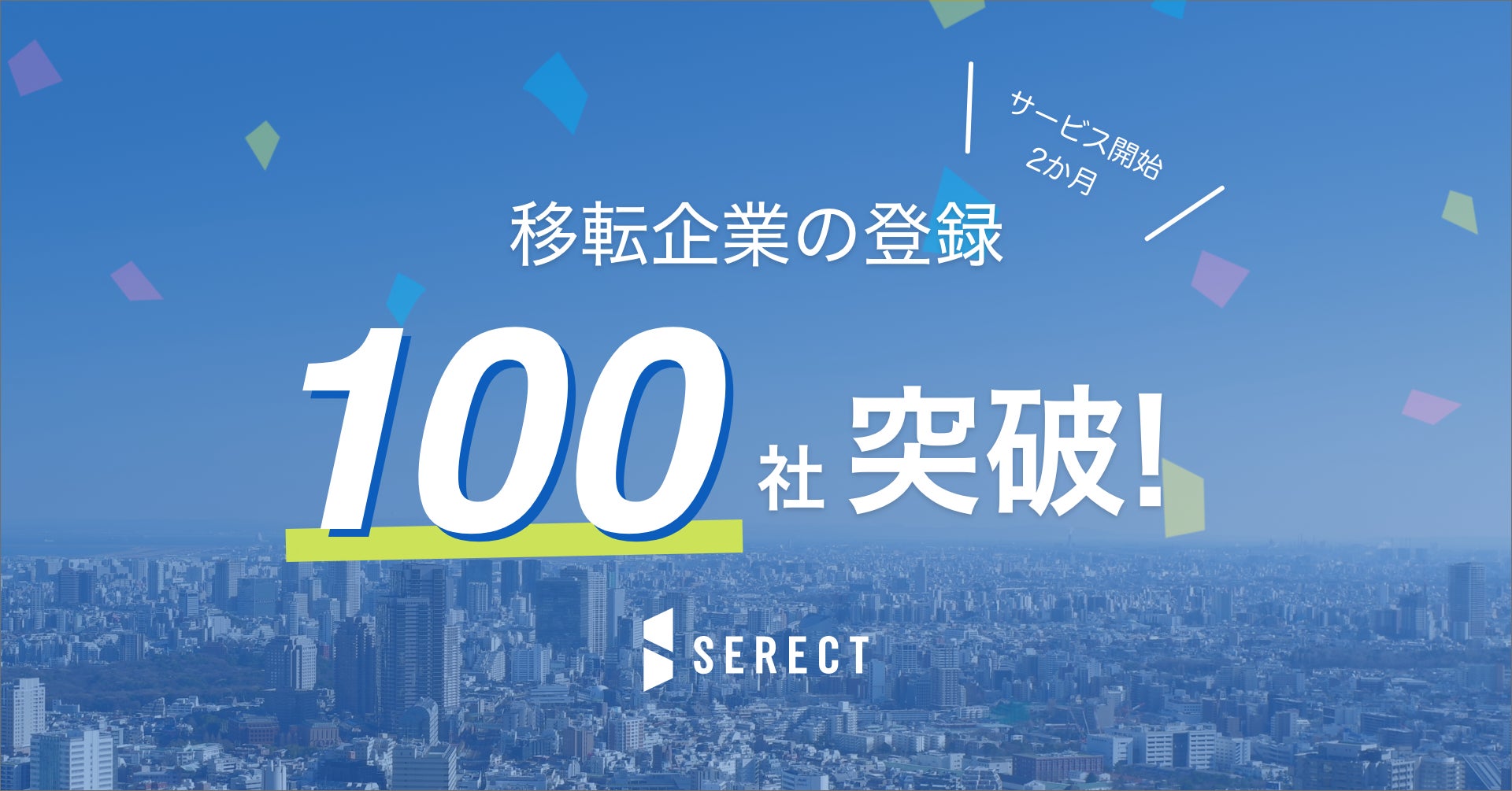 ありがたいことに大きな反響を呼び、サービス開始2か月で、移転を検討する企業からの登録社数が100社を突破いたしました!登録企業様もスタートアップから大企業まで幅広く登録が進んでおり、オフィス移転の新たな選択肢として「SERECT(セレクト)」が選ばれはじめています。
