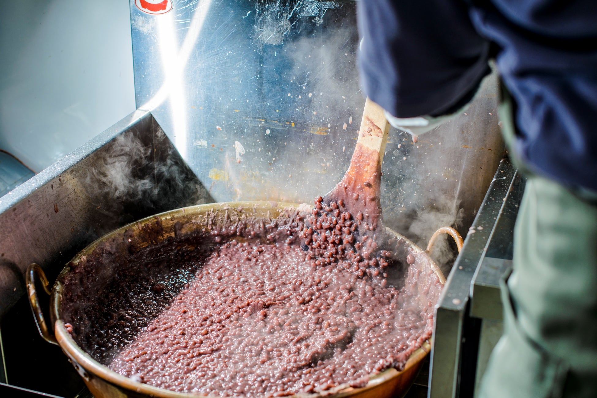 北海道産の小豆を手選別し、じっくりと大鍋でコトコトと下茹で。お玉で丁寧に灰汁を取り、その後蜜漬けし一晩寝かせます。翌日、馴染んだあんこを一気に練り上げもう一晩休ませることで、ふっくらと口当たりの良い優しい味わいの自家製あんこが出来上がります。じつに4日間、手間暇かけて仕上げます。一方どら焼きの皮も、卵を割るその仕込み工程からもちろん手作業。一晩休ませた生地を、銅板で一枚ずつ丁寧に手焼きをします。小嶋やのどら焼きがコロンと丸いフォルムなのは、一つずつどら皮であんこを“包む”作業を行うからです。挟むのではなく、包むことであんこの旨味を逃がしません。手でゆっくりとどら焼を半分に割ると縦方向に美しく筋が通っており、口の中でほどけるような食感を生み出します。