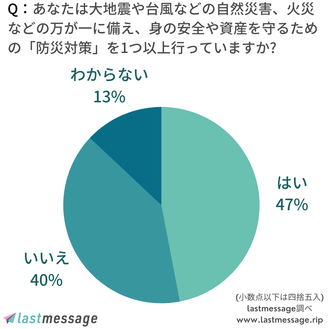 「あなたは大地震や台風などの自然災害、火災などの万が一に備え、身の安全や資産を守るための『防災対策』を1つ以上行っていますか?」の問いに対して、1つでも対策を行っていれば「はい」に含みますが、左図の通り、何も対策を行っていない「いいえ」と答えた人が40%と半数に満たない数値でした。