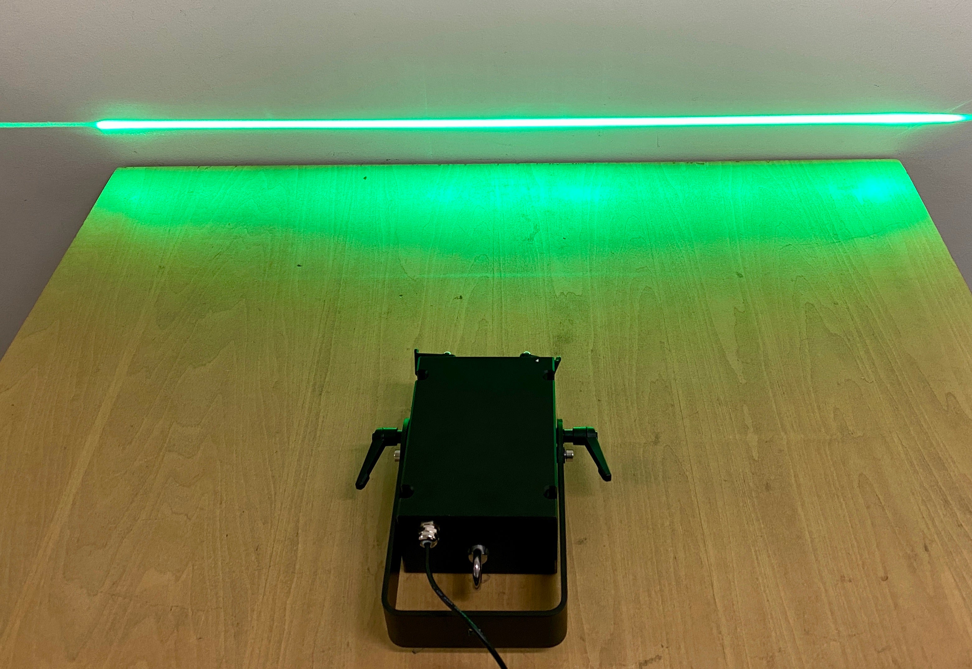 手のひらサイズの筐体から、一直線のレーザーを照射します。