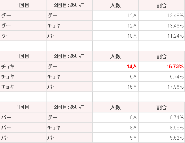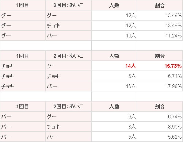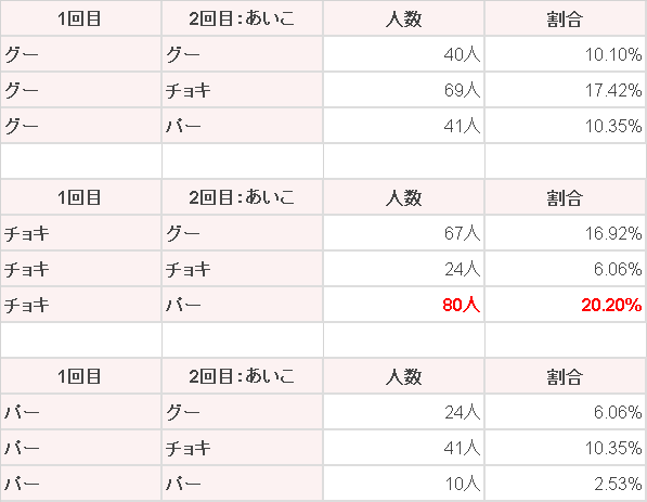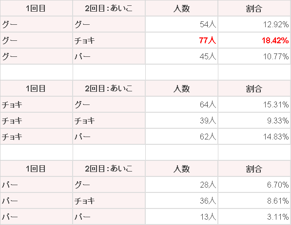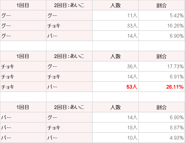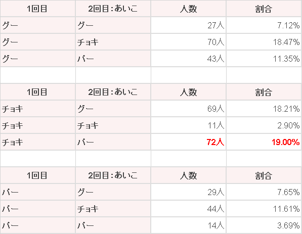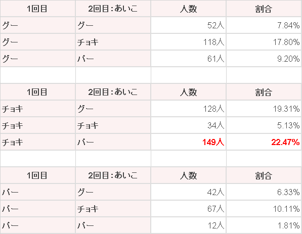 一番少ないパターンは、パーを出して次もまたパーを出すというものでした。