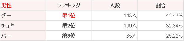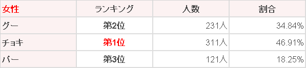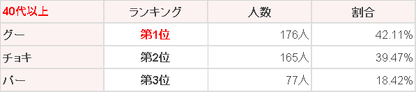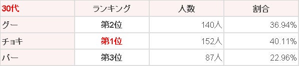 20代の1位はチョキ、30代の1位もチョキ、40代以上での1位はグーという結果でした。