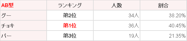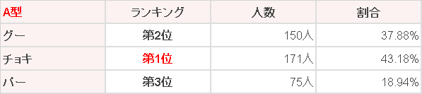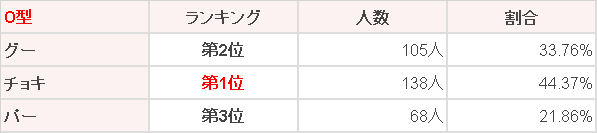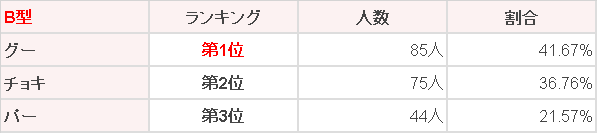血液型別に集計することで傾向が見えてくるかと思いましたが、わかったことはB型以外は第1位がチョキ、第2位がグー、第3位がパーと同じ順番だということです。