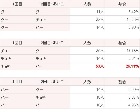 1回目にあいこで勝負がつかなかった時には違う手で攻めるという傾向があること、そのグー・チョキ・パーの割合はちょうど3等分した数字であることから、じゃんけんの勝率は運の要素が高いということでしょうか。