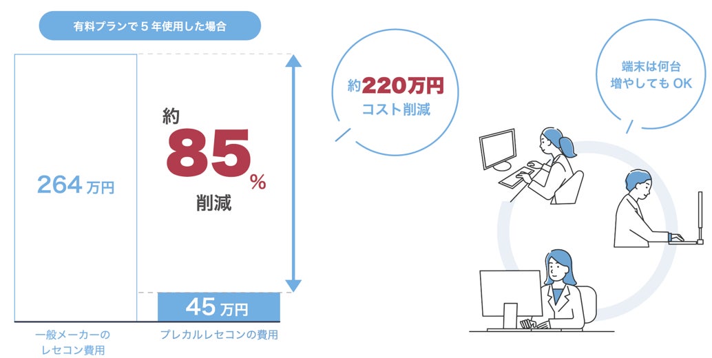 プレカルレセコンを5年間使用した場合、コストは従来の約1/10に。1ライセンスさえあれば複数端末で同時に利用することもできます。