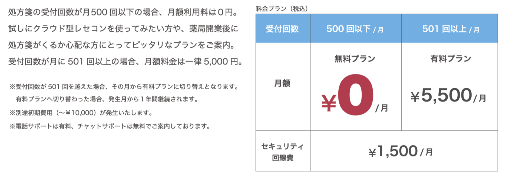 処方箋の受付回数が月に500回以下の場合、月額利用料は0円。