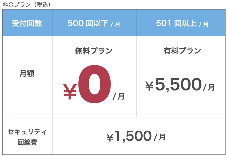 ※受付回数が501回を越えた場合、その月から有料プランに切り替えとなります。有料プランへ切り替わった場合、発生月から1年間継続されます。