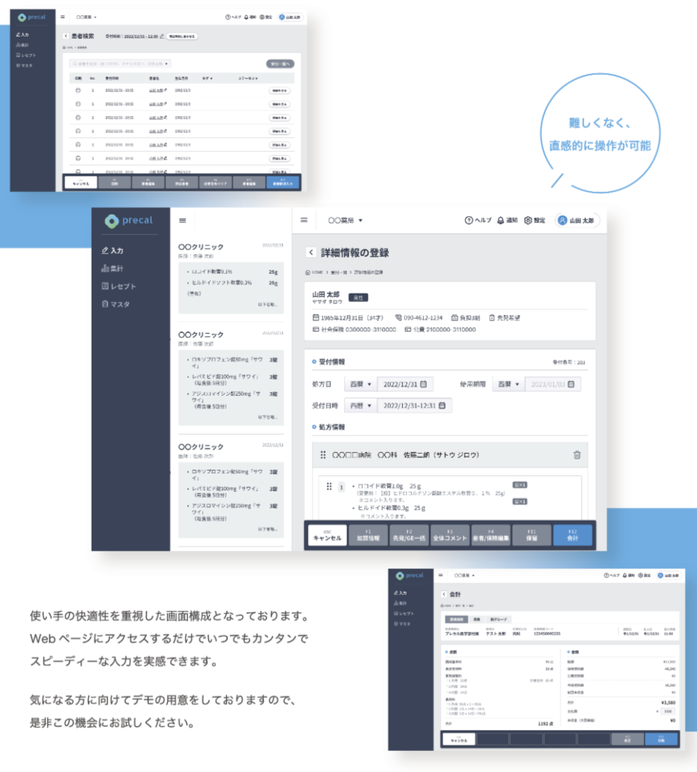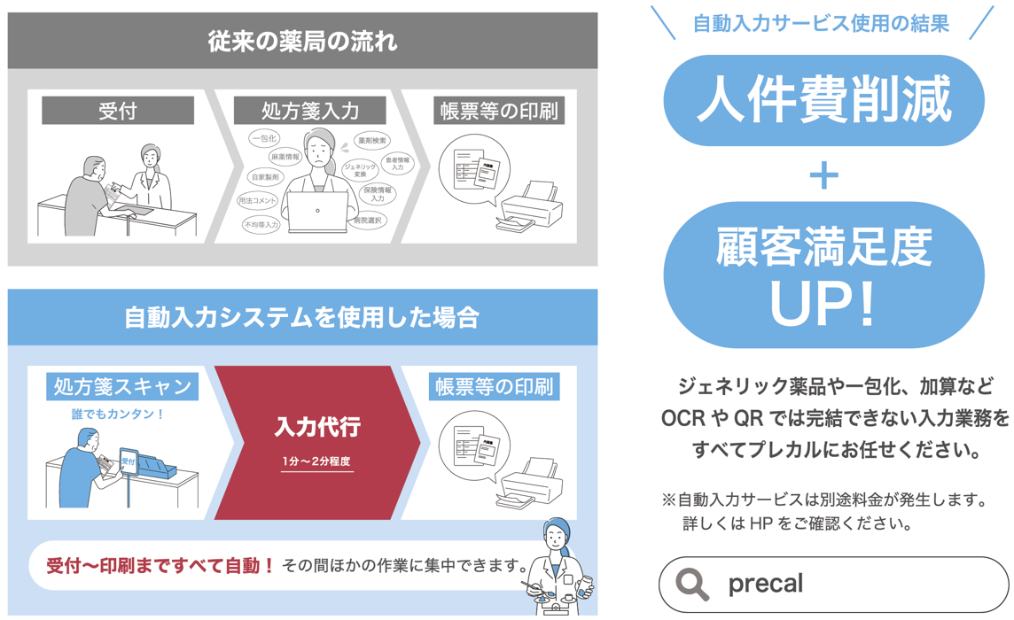 処方箋入力代行サービス「precal(プレカル)」は、処方箋入力業務をオンライン事務員が全て遠隔で代行、