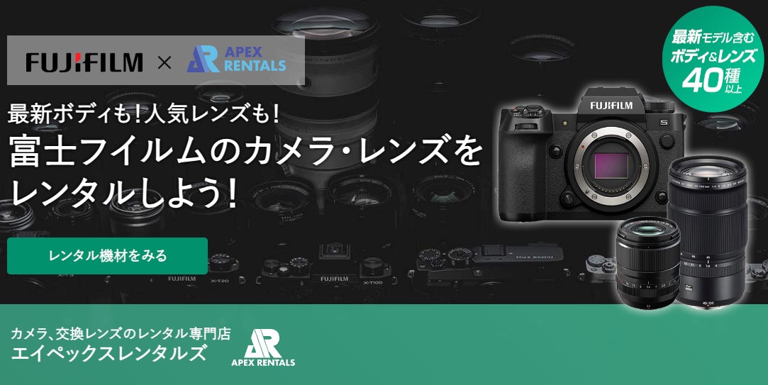 デジカメ、ビデオカメラ、パソコンなどのレンタルサービス「APEX RENTALS」を手がける株式会社ビデオエイペックス(本社:大阪市北区東天満2−2−17 代表取締役社長:片山洋平、以下:弊社)は、富士フイルムイメージングシステムズ株式会社との取引開始により、本日2023年2月1日(水)よりカメラ・レンズレンタル事業を拡大し、富士フイルム製のミラーレスデジタルカメラ(X/GFXシリーズ)・各種交換レンズ(X/GFマウント)の商品ラインアップを拡大することをお知らせ致します。
