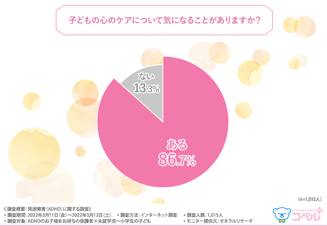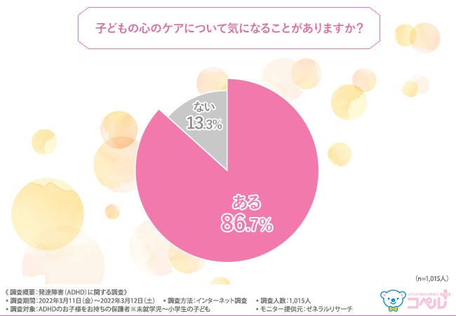 そこで、「子どもの心のケアについて気になることがありますか?」と質問したところ、8割以上の方が『ある(86.7%)』と回答しました。