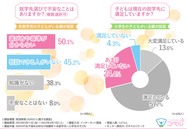 「就学先選びで不安なことはありますか?(複数選択可)」と質問したところ、『選び方や基準が分からない(50.1%)』『相談できる人がいない(45.2%)』と回答しました。