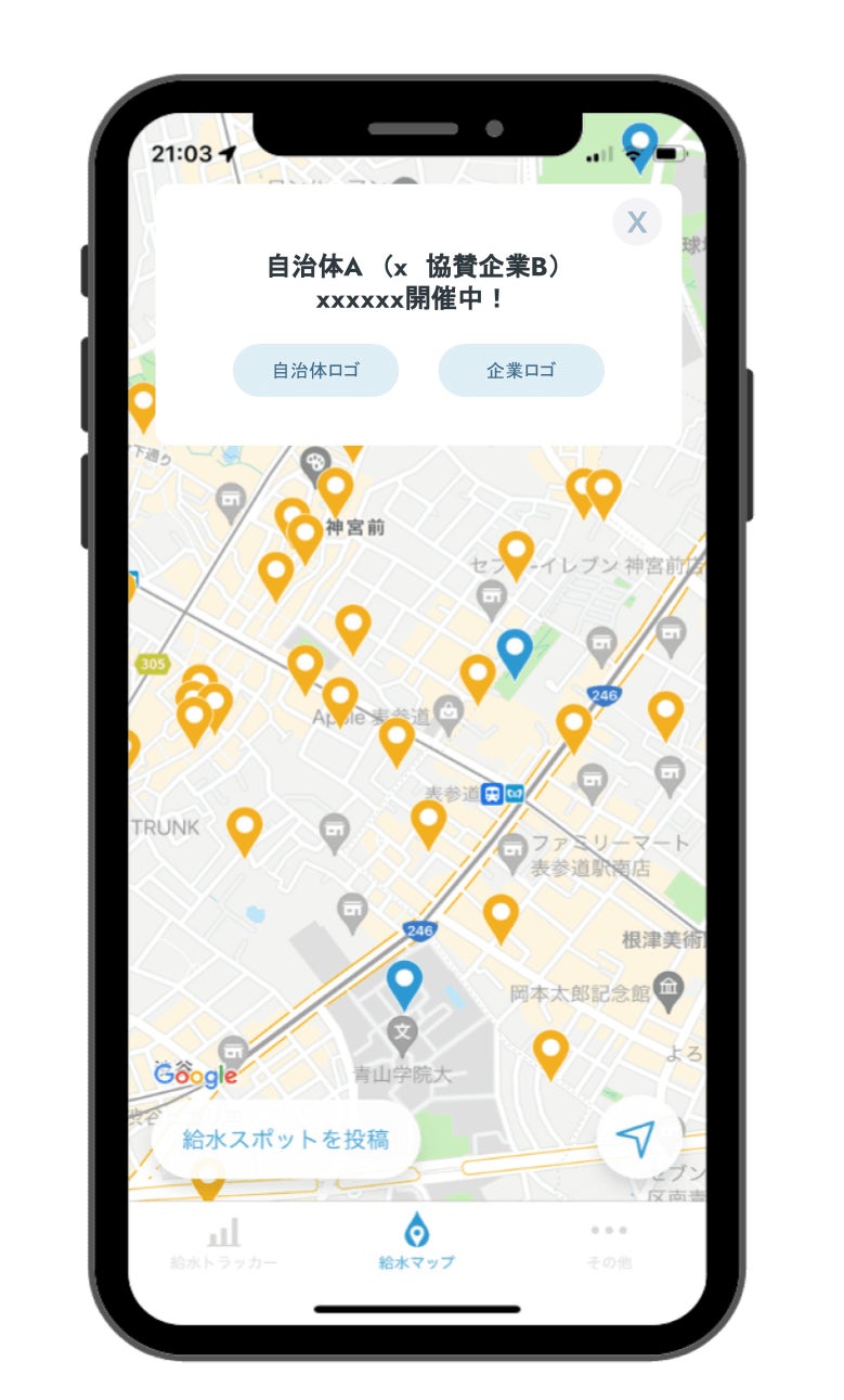 アライアンス登録した自治体には、mymizuが知的財産権やスキル・ノウハウを保有する啓発素材(環境問題や使い捨てプラスチックごみに関するもの等)の使用許諾する他、mymizuアプリ内にて自治体施策の紹介、年間の給水スポット増減数の共有や他自治体との交流機会、企業及び教育機関等との連携機会等を提供いたします。