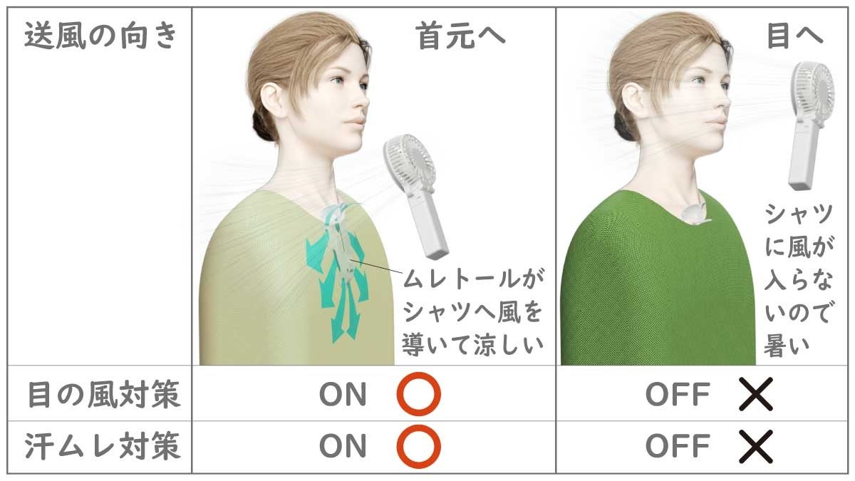 そこで、東京ファン株式会社(所在地:埼玉県川越市)は、ハンディ扇風機の風を首元へ向けると、シャツに風が遮られることなく、インナーの中まで風が入るようになる新製品「ムレトール」を開発しました。ムレトールを使うと、扇風機の風を目に向けるよりも、首元へ向けた方が体のムレを取り除く「爽快感」が得られます。これにより、目の風対策をより涼しくサポートします。また、ムレトールは、暑い夏に止まらない脇汗や胸汗が、ニオイに変わる前に、シャツの中に風を入れて汗ムレを取りたいときの「汗ムレ対策」にも便利です。