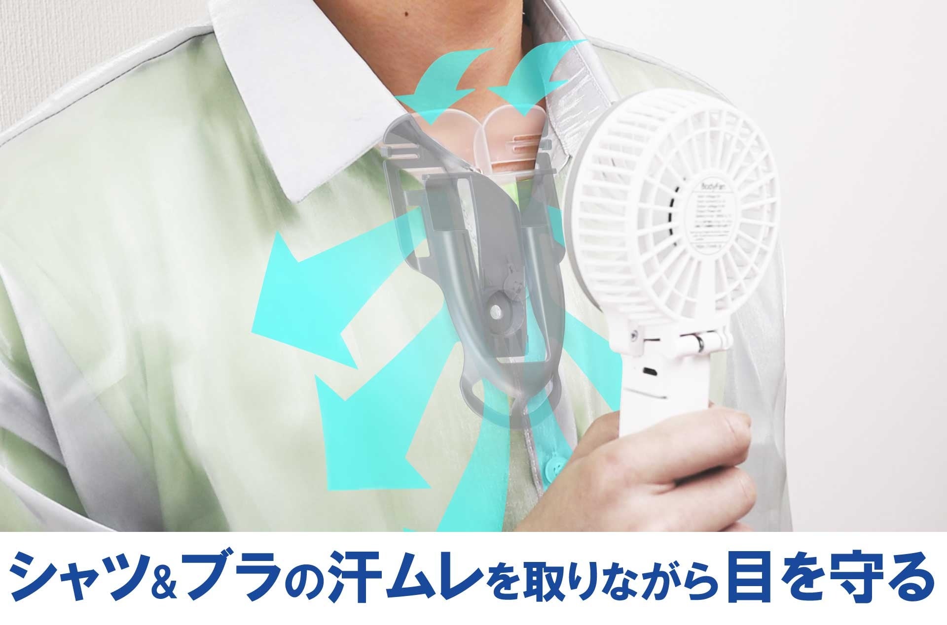 熱中症対策で使うハンディ扇風機の風で目を傷めないための「目の風対策」と,シャツやブラの汗ムレを取る「汗ムレ対策」を同時に実現する『ムレトール』新発売!東京ファン株式会社