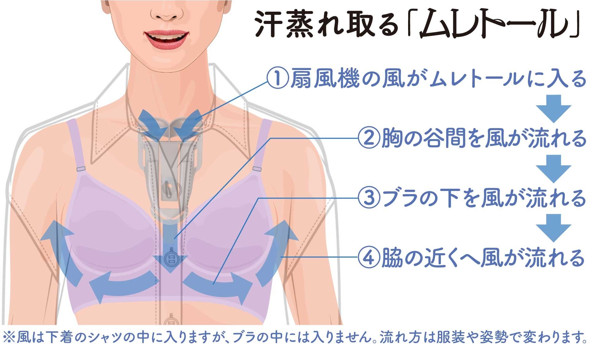 夏の汗ばむシーズンは、ブラによる胸の汗ムレに悩む女性が多いです。ムレトールを試用した女性モニターからは、「風がシャツの中で、下図のように流れることで、ブラ付近の汗ムレ対策にも使える」という意見が寄せられました。