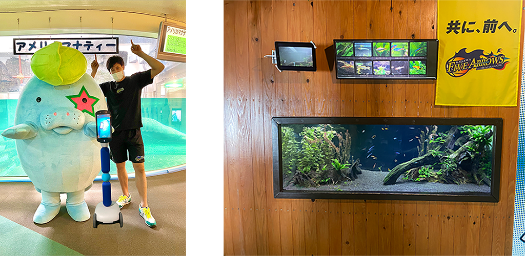 日本で6頭しかいないアメリカマナティのうち2頭がいる山の上の水族館「新屋島水族館」にavatarin(株)が開発した遠隔操作ロボットnewme(ニューミー)を設置し、谷口選手とマナやんと共にnewmeで館内を自由に動き回る体験です。