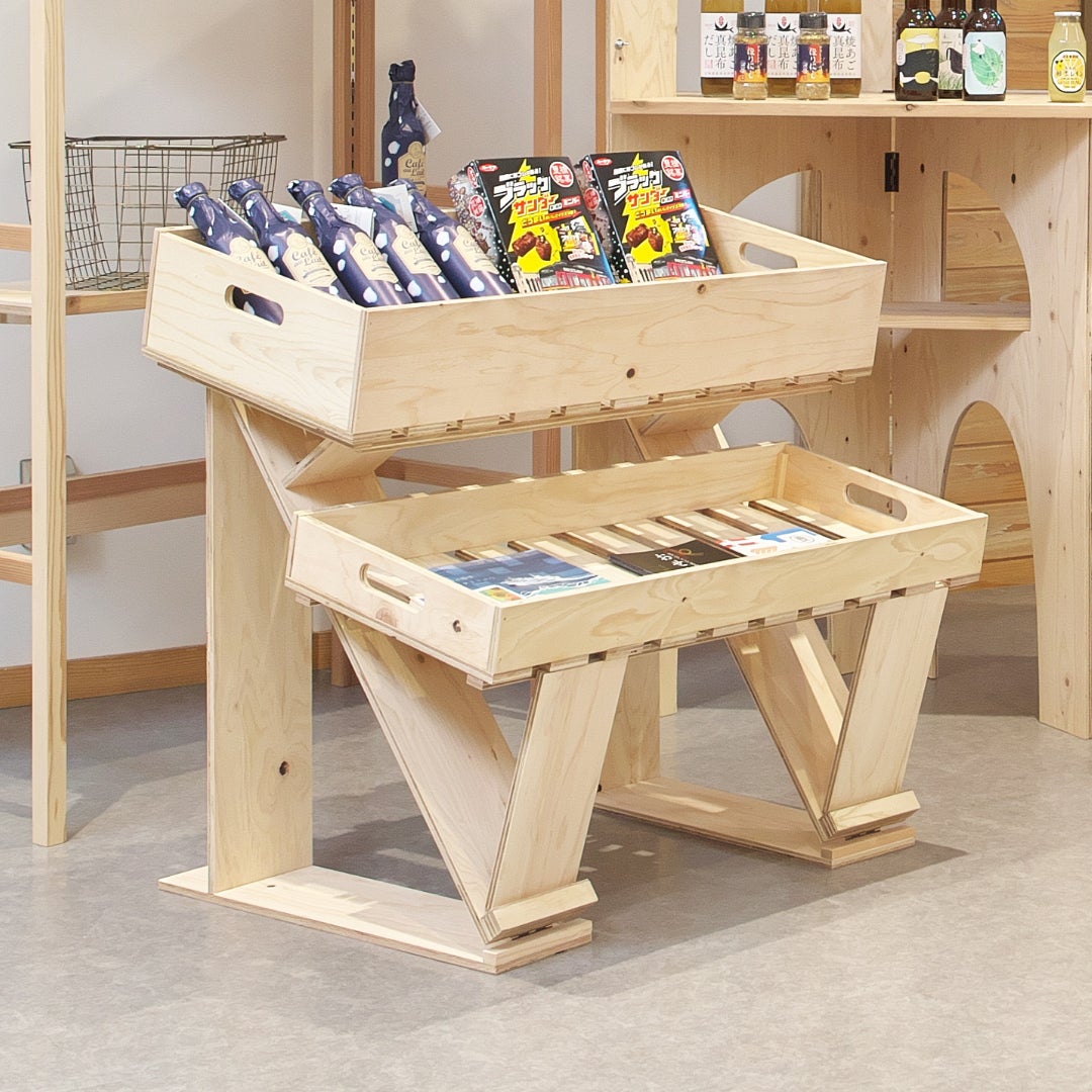 ■斜め置き台 展開時のサイズ 約)幅85×奥行72×高さ81cm 木箱大 約)幅85×奥行40×高さ15cm 木箱小 約)幅80.5×奥行36×高さ8.5cm 総重量 約10kg 価格 28000円(税込・送料込み一部地域を除く)