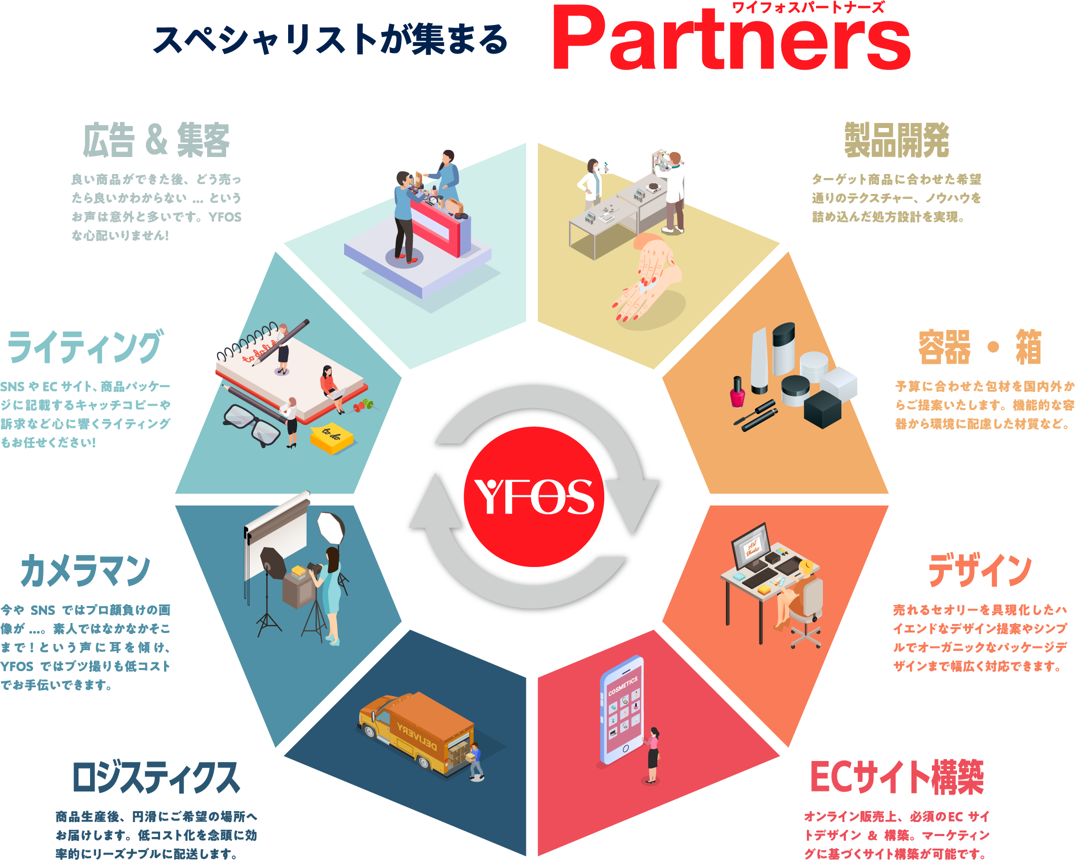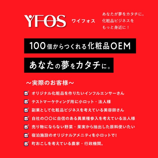 株式会社プルソワン(本社:⼤阪府⼤阪市北区中津1-11-11中津第⼀リッチビル3F)の運営する化粧品OEMプラットフォームYFOSは、⼩ロットから受託開発・製造可能な化粧品OEMをサポートしています。