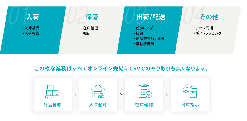 倉庫との面倒なCSVの受け渡しがなくなり、EC事業者さまの手間を大幅に省くことができます。