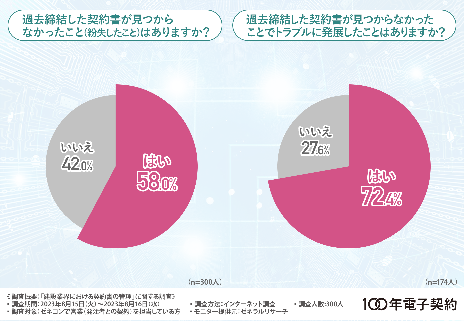 「過去締結した契約書が見つからなかったこと(紛失したこと)はありますか?」と質問したところ、およそ6割の方が『はい(58.0%)』という結果となりました。