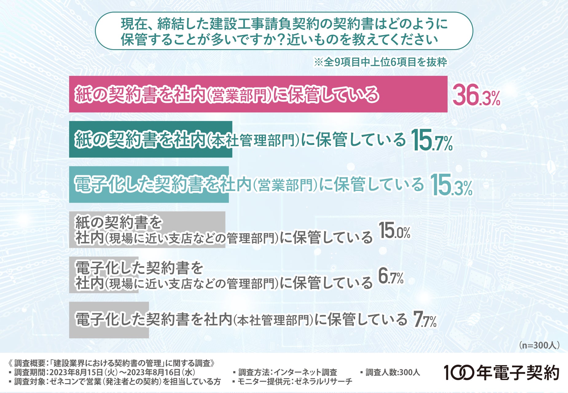 「現在、締結した建設工事請負契約の契約書はどのように保管することが多いですか?近いものを教えてください」と質問したところ、『紙の契約書を社内(営業部門)に保管している(36.3%)』と回答した方が最も多く、次いで『紙の契約書を社内(本社管理部門)に保管している(15.7%)』『電子化した契約書を社内(営業部門)に保管している(15.3%)』『紙の契約書を社内(現場に近い支店などの管理部門)に保管している(15.0%)』『電子化した契約書を社内(本社管理部門)に保管している(7.7%)』と続きました。