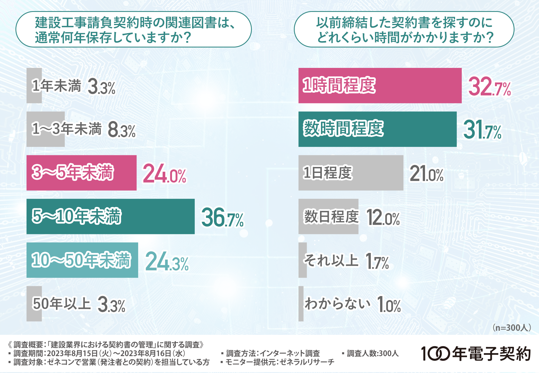 そこで今回、独自開発による日本で初めての電子契約サービス『100年電子契約』(https://le-techs.com/100yr/)を提供するリーテックス株式会社は、ゼネコンで営業(発注者との契約)を担当している方を対象に、「建設業界における紙での契約の問題点」に関する調査を実施しました。
