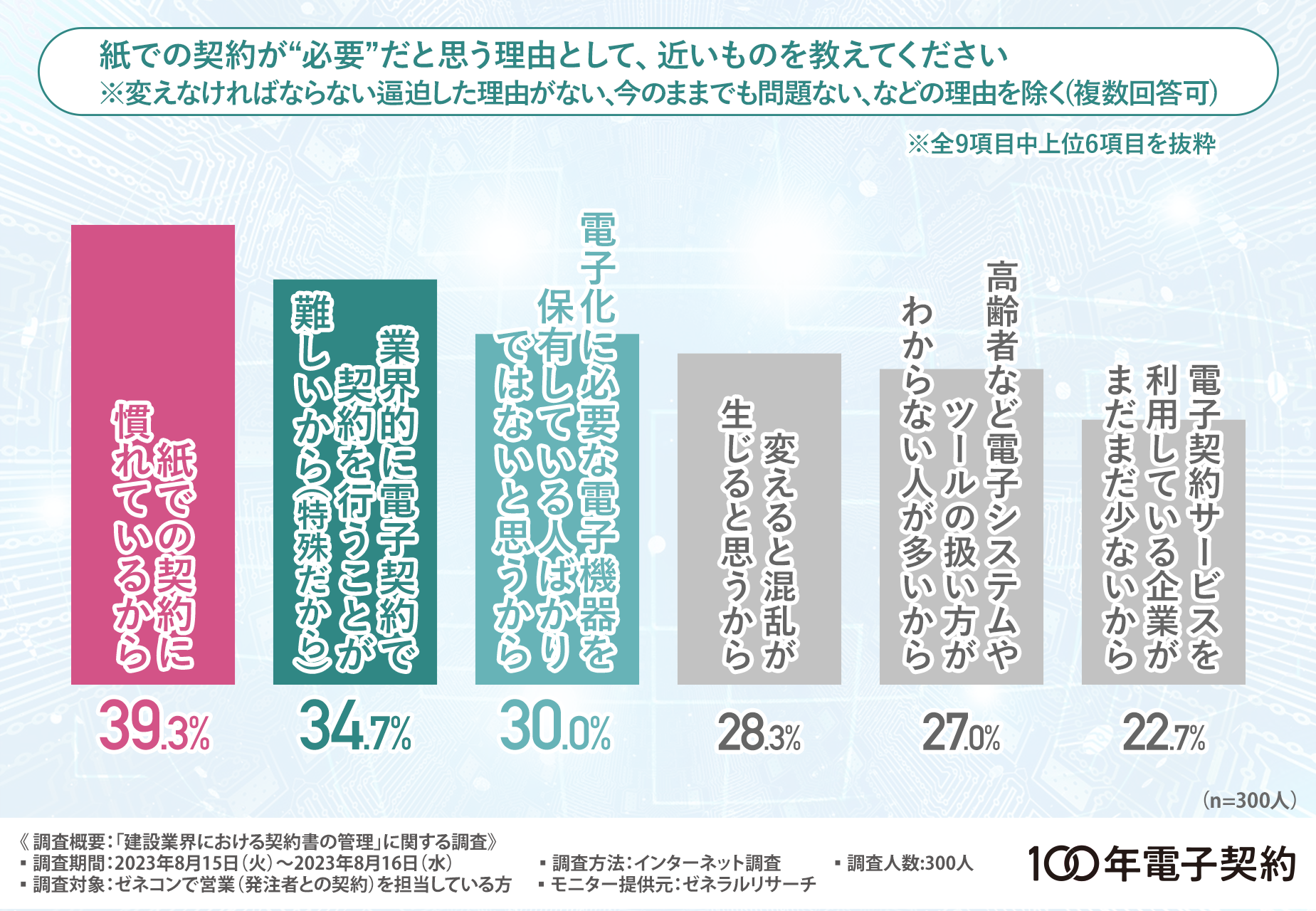 「紙での契約が“必要”だと思う理由として、近いものを教えてください ※変えなければならない逼迫した理由がない、今のままでも問題ない、などの理由を除く(複数回答可)」と質問したところ、『紙での契約に慣れているから(39.3%)』と回答した方が最も多く、次いで『業界的に電子契約で契約を行うことが難しいから(特殊だから)(34.7%)』『電子化に必要な電子機器を保有している人ばかりではないと思うから(30.0%)』『変えると混乱が生じると思うから(28.3%)』『高齢者など電子システムやツールの扱い方がわからない人が多いから(27.0%)』と続きました。