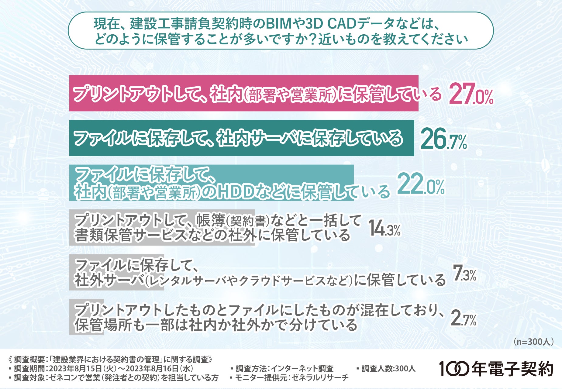 「現在、建設工事請負契約時のBIMや3D CADデータなどは、どのように保管することが多いですか?近いものを教えてください」と質問したところ、『プリントアウトして、社内(部署や営業所)に保管している(27.0%)』と回答した方が最も多く、次いで『ファイルに保存して、社内サーバに保存している(26.7%)』『ファイルに保存して、社内(部署や営業所)のHDDなどに保管している(22.0%)』『プリントアウトして、帳簿(契約書)などと一括して書類保管サービスなどの社外に保管している(14.3%)』『ファイルに保存して、社外サーバ(レンタルサーバやクラウドサービスなど)に保管している(7.3%)』と続きました。